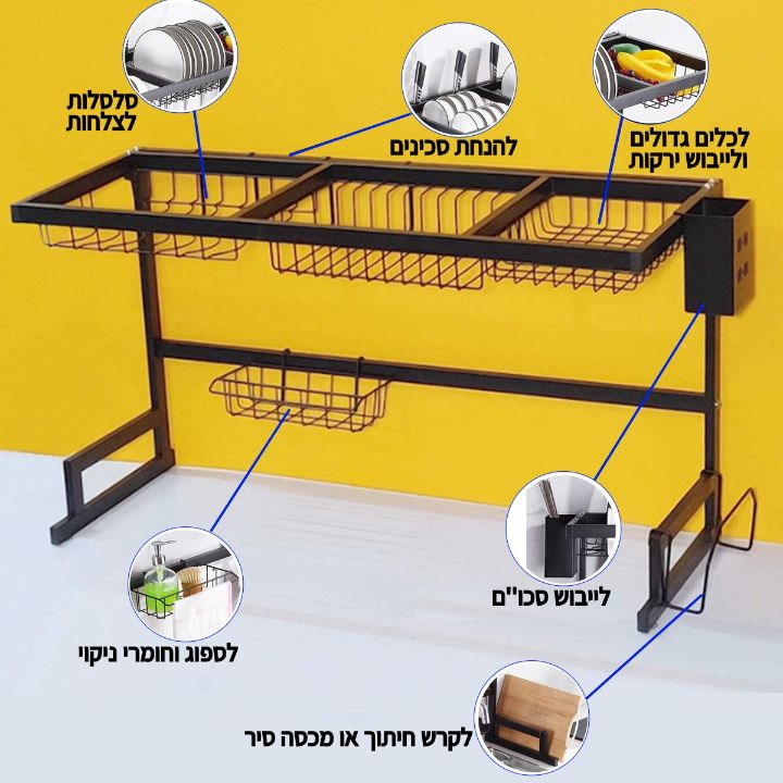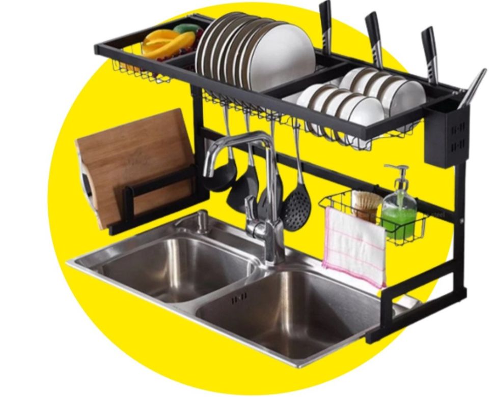 מעמד כלים מעל הכיור כולל את כל מה שצריך כדי לארגן מטבח בקלות.